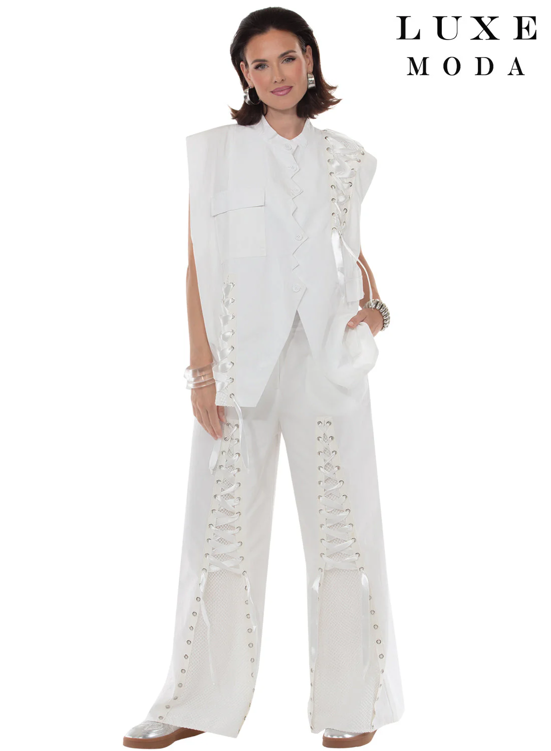 Love The Queen 17666, 2PC Vest & Pant Set Color: Black, White Sizes: S, M, L, XL, 1X, 2X Vest Length: 28" Pant Inseam: 30"